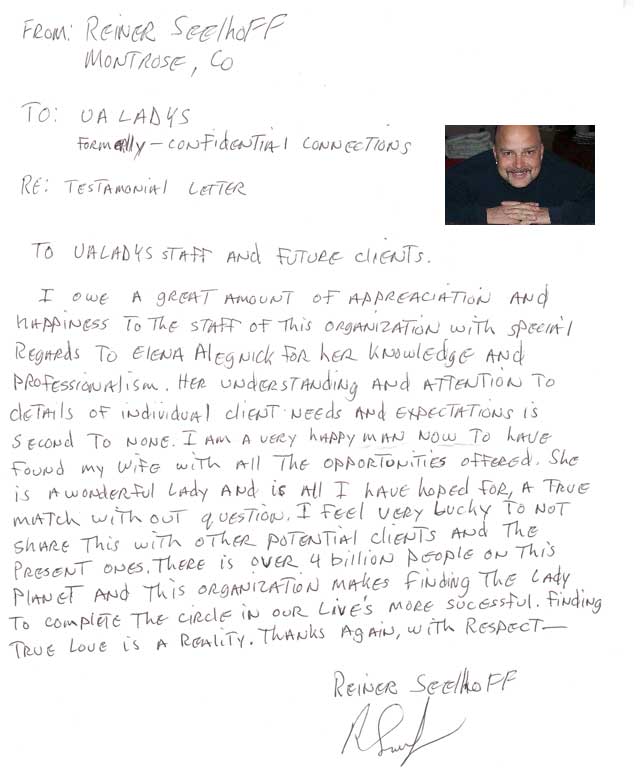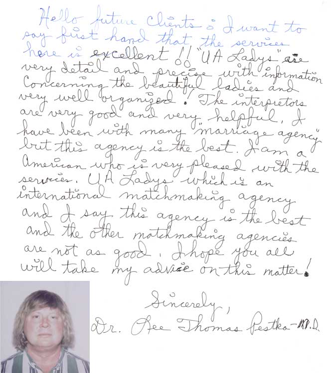 Dear Gentlemen, here we are happy to represent you the Testimonials of the customers who have found their soulmates with the help of the Marriage Making Agency. Here they express their opinion, experience and suggestions for those who are looking for a second half in another country and appreciation to the company and the staff.